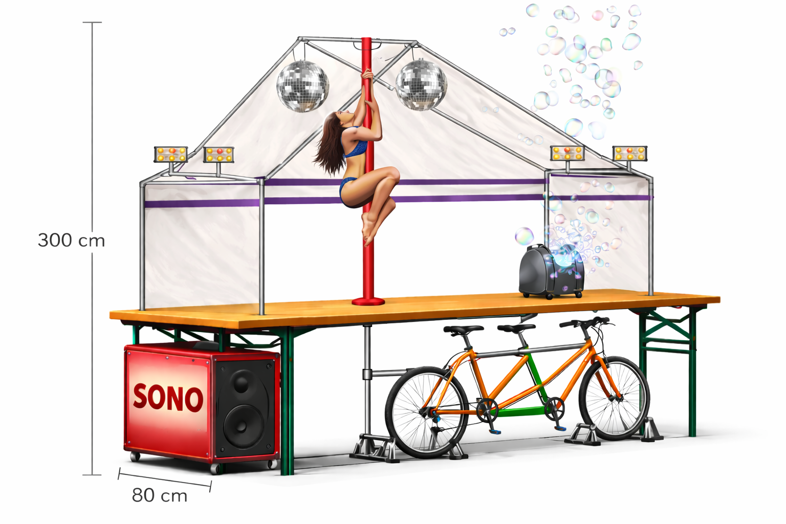Créer un char roulant festif et sécurisé, représentant une piste de danse géante années 80, capable d’embarquer musique, danseurs et bonne humeur sur tout le parcours du Marathon du Médoc.